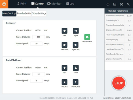 2. Automatic Printing; BLT-MCS can perform automatic printing depending on the operator's settings. The operator can choose the starting print layers, the finished print layers, the print method and the powder spreading method. During the automatic printing process, the operator can also set device parameters such as powder delivery amount and powder spreading rate.
