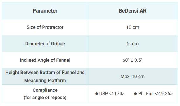 The BeDensi AR is designed with great attention to detail for accurate measurement of powder angle of repose. This measurement pertains to the angle formed by the sloping side of a powder cone under specific circumstances and is a crucial measure of powder flow characteristics. Improved flowability is associated with a smaller angle of repose. Comprehending the angle of repose is vital for evaluating and enhancing processes that entail handling powdered substances.